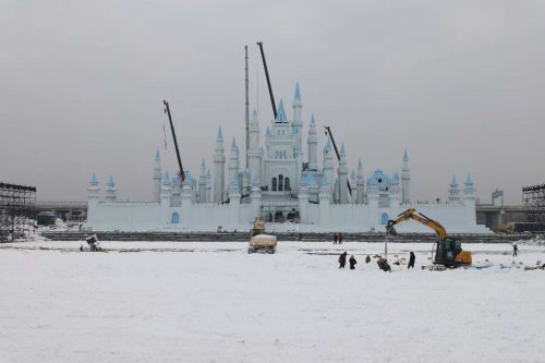 这段时间,路过伊通河畔的肆季南河岸线公园,远远可以望见对岸一座白墙蓝顶的童话城堡已清晰成型。河面上,大型造雪机正马力全开,莹白雪花漫天飞舞,如柔软绒毯覆盖河流两岸。工人们与数十台大型机械紧密配合,精心修整着滑雪道、为雪人矩阵堆砌塑形,一座由冰雪构筑的梦幻王国正拔地而起。